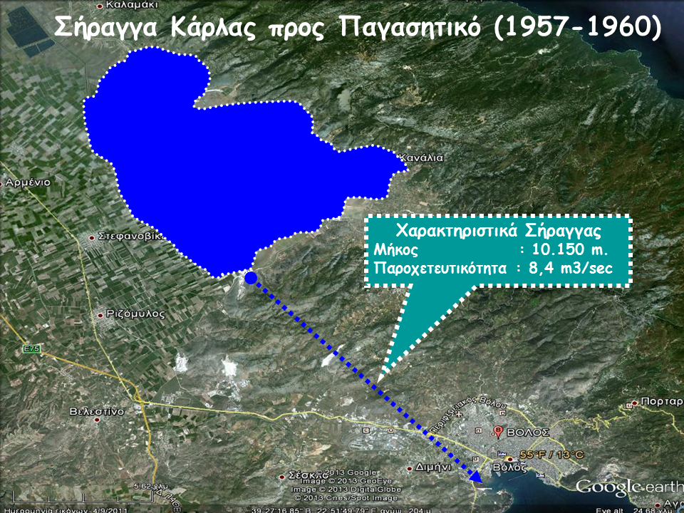 Όπως προαναφέραμε βασικό χαρακτηριστικό της λίμνης Κάρλας ήταν η έλλειψη διεξόδου των νερών της λεκάνης απορροής της. Το επόμενο βήμα, ήταν η αποστράγγιση όλων των ανεπιθύμητων αλατούχων υδάτων (ελών και λίμνης). Αυτό έγινε από το 1959 έως το 1962 με την κατασκευή σήραγγας (μήκους 10.150 μέτρων, διατομής 4,35 μέτρων και παροχής 8,5 κ.μ./sec) η οποία κατευθύνει τα νερά στον Παγασητικό κόλπο, μέσω ανοικτού αγωγού που διέρχεται από το πολεοδομικό συγκρότημα του Βόλου. Έτσι με την απαγωγή των νερών προς τον Παγασητικό κόλπο το 1962, επιτεύχθηκε μεν η ΑΞΕ της λίμνης, όχι όμως η αντιπλημμυρική προστασία της περιοχής. Άλλωστε η παροχευτική ικανότητα της σήραγγας δεν είχε σχεδιασθεί για αυτόν τον σκοπό. Σύμφωνα με τις μελέτες του Παπαδάκη (1956) και του Νικολαϊδη (1960), η αντιπλημμυρική προστασία απαιτούσε και τη δημιουργία του ταμιευτήρα διότι για την άμεση απαγωγή των νερών προς τη θάλασσα θα έπρεπε να κατασκευασθεί σήραγγα με παροχετευτική ικανότητα μερικών εκατοντάδων κυβικών μέτρων το δευτερόλεπτο. Η κατασκευή ενός τέτοιου έργου ήταν τεχνικά προβληματική και οικονομικά ασύμφορη.