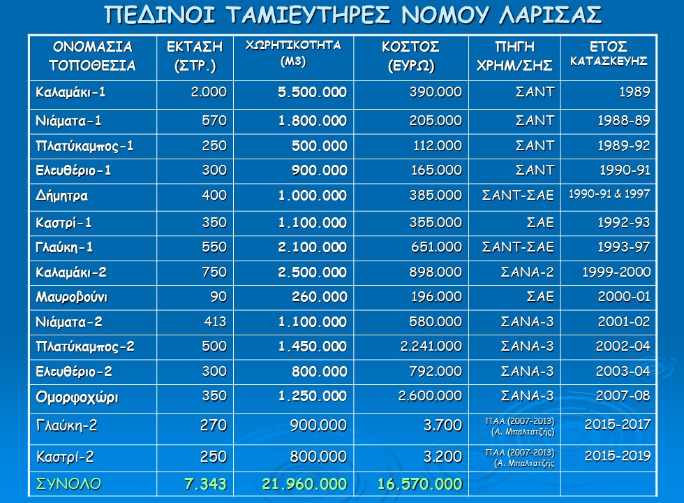 Ειδικότερα στη Θεσσαλία από το 1987 μέχρι το 2019 έγιναν 18 πεδινοί ταμιευτήρες με συνολική χωρητικότητα για αποθήκευση 25.000.000 μ3 νερού (εκτός του μεγάλου Ταμιευτήρα Κάρλας έκτασης 38.000 στρ.).